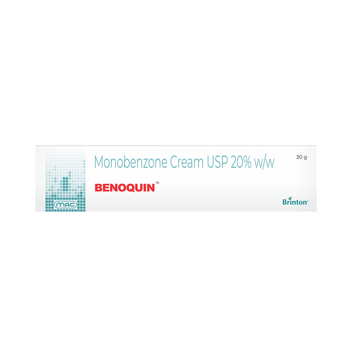 Benoquin Cream is used for depigmentation. It is used to permanently lighten the skin in people with extensive vitiligo. It works by increasing the elimination of melanin from skin cells. Benoquin Cream is for external use only. You should always use it exactly as your doctor has told you. You must wash your hands thoroughly before and after applying this medicine. This medicine should be used regularly to get the most benefit from it. Do not use more than you need as some side effects may be increased. Benoquin Cream has a few potential side effects but not everyone will get them. These may include application site reactions like burning, irritation, itching, and redness. Serious allergic reaction to this drug is rare but let your doctor know if you’re bothered by side effects or they do not go away. Make sure you read the instructions that come with your medicine. Avoid contact with eyes. In case of accidental contact, you should rinse your eyes thoroughly with water. You can start applying Benoquin Cream to a small portion of unbroken skin or near the pigmented area for a period of several days for checking allergic reaction. You should discontinue it if itching, excessive inflammation, or swelling occurs. Pregnant or breastfeeding women should also consult their doctor before taking this medicine. If no improvement is seen after two months of treatment, the use of this product should be discontinued.