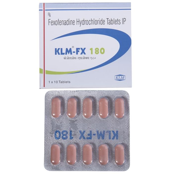 KLM-FX 180 Tablet is an anti-allergy medicine used in the treatment of allergic symptoms such as runny nose, congestion or stuffiness, sneezing, itching, swelling, and watery eyes. It also helps treat skin allergies with itching, redness, or swelling. KLM-FX 180 Tablet may be taken with or without food, in the dose and duration as advised by the doctor. The dose you are given will depend on your condition and how you respond to the medicine. You should keep taking this medicine for as long as your doctor recommends. Do not stop taking it without consulting your doctor. The most common side effects are headache, drowsiness, dizziness, and nausea. Most of these are temporary and usually resolve with time. Please consult your doctor if any of these side effects do not resolve or persist for a longer duration. Do not self-medicate or recommend your medicine to another person even if you see the similarity in symptoms. Consult your doctor to get the most benefit. Inform your doctor if you are suffering from any problems related to the kidneys, liver, or heart. Pregnant and breastfeeding mothers should not take this medicine without consulting a doctor.