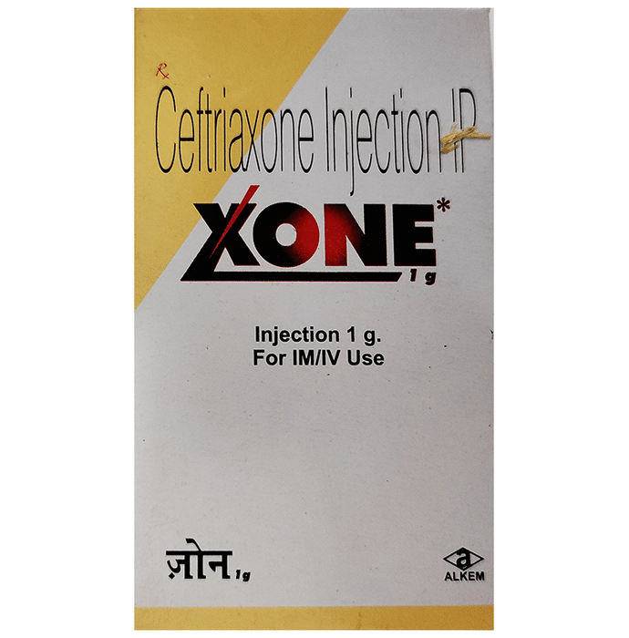 Xone 1000mg Injection is an antibiotic belonging to the cephalosporin group, which is used to treat bacterial infections in your body. It is effective in infections of the brain (e.g., meningitis), lungs (e.g., pneumonia), ear, urinary tract, skin & soft tissues, bones & joints, blood, and heart. Xone 1000mg Injection may also be used to prevent infections during surgery. It is given as a drip (intravenous infusion) or as an injection directly into a vein or a muscle under the supervision of a healthcare professional. Your doctor will decide the correct dose for you. This medicine will be given to you regularly at evenly spaced intervals as per the schedule prescribed by your doctor. Do not skip any doses and finish the full course of treatment even if you feel better. Stopping the medicine too early may lead to the returning or worsening of infection. The most common side effects of this medicine include diarrhea, rash, and changes in liver function tests and blood cell counts. Some people may develop temporary redness or pain at the site of injection. These side effects are usually mild but let your doctor know if they bother you or do not go away. Before taking it, you should let your doctor know if you are allergic to any antibiotics or have any kidney or liver problems. You should also let your healthcare team know all other medicines you are taking as they may affect, or be affected by this medicine.