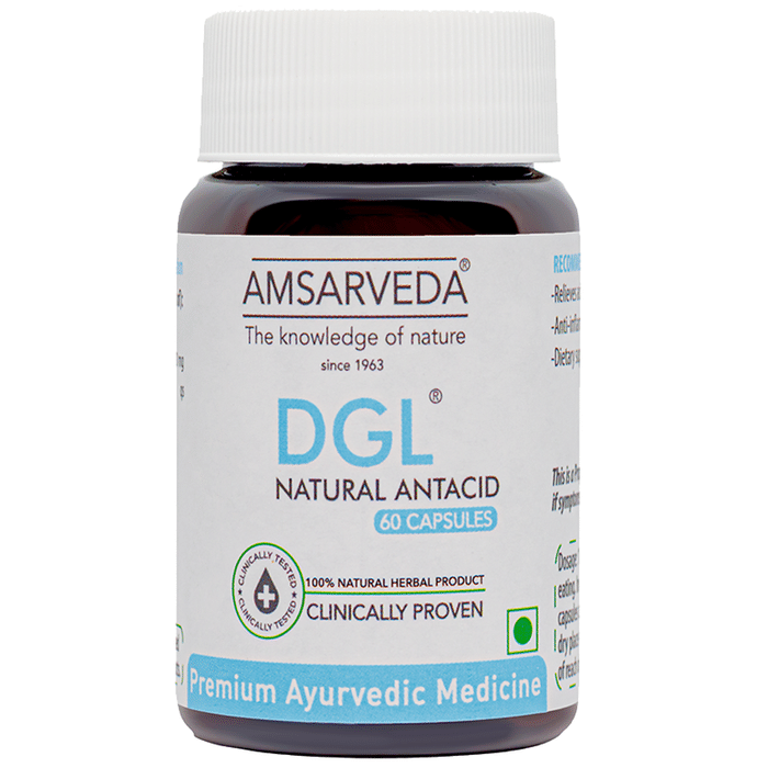 Amsarveda DGL Capsule is a health supplement which can help alleviate respiratory and gastrointestinal discomforts. It may promote healing by increasing mucous production and blood supply to the stomach. | Key Ingredients: Liquorice | Key Benefits: These capsules can help provide relief from acidity It has anti-inflammatory properties It may ease acid reflux | Directions For Use: Take 1 capsule 30 minutes before eating or as directed by the physician. | Safety Information: Read the label carefully before use Store in a cool and dry place away from sunlight Keep out of reach of children