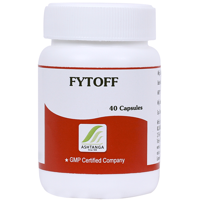 Ashtanga Fytoff Capsule is known to be effective in the treatment of sinusitis, runny nose, continuous sneezing and nose blockage. It is helpful in treating respiratory disorders like shortness of breath, common cold or asthma. | Key Ingredients: Solanum anguivi Clerodendrum serratum Embelia ribes Ocimum sanctum | Key Benefits: It has antiviral, antibacterial & antifungal activities Helps treating allergic respiratory disorders Highly effective against sinusitis Used in the treatment of ENT problems Used in runny nose, sneezing, nose block | Directions For Use 1 to 2 capsule 2 to 3 times day (or) as directed by the physician. | Safety Information: Read the label carefully before use Keep out of reach of the children Store in a cool dry place away from direct sunlight Use under medical supervision There have been no adverse events reported from the use of Fytoff Fytoff does not have any contraindications