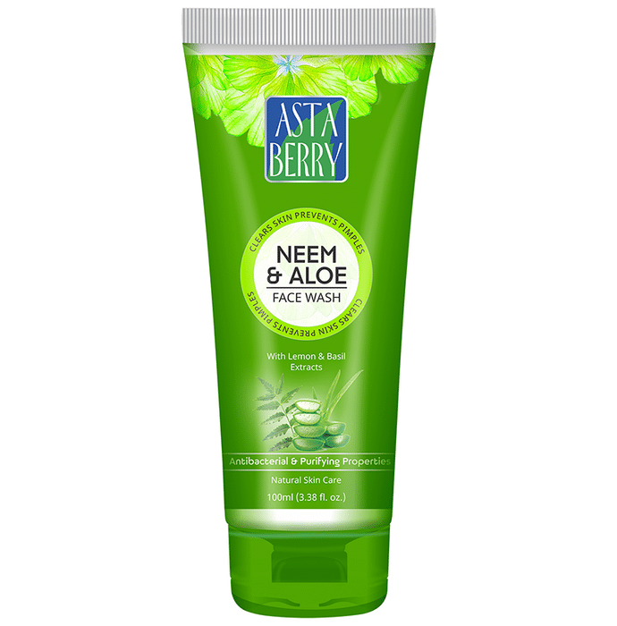 Astaberry Neem & Aloe Face Wash Astaberry Neem & Aloe Face Wash prevents acne, blemishes, and pimples and is based on Ayurvedic principles. It makes your face clear and prevents acne-causing germs. It deep cleanses your skin and unclogs pores. Your skin looks fresh and becomes beautiful and glowing. It contains neem, which has antibacterial and antifungal properties, and aloe vera, which naturally reduces redness and inflammation around acne and pimples. The aloe vera face wash removes dirt from your skin and makes it soft and supple.