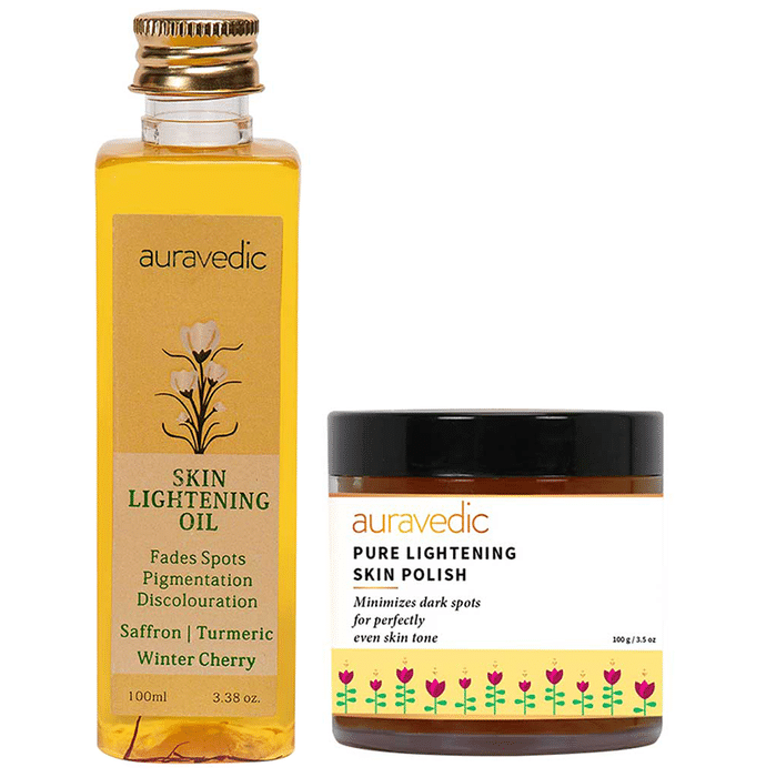 Auravedic Combo Pack of Skin Lightening Oil (100ml) & Pure Lightening Skin Polish (100gm) can help moisturise and nourish the skin. It can help bring out the natural glow and brightness of the skin. Moreover, it can help deep cleanse the skin to improve the skin texture. | Key Ingredients: Turmeric oil Vitamin E | Key Benefits: This oil can be effective in dealing with fine lines, black head and acne It can lighten the skin tone to combat hyperpigmentation It may bring out the natural radiance and texture of the skin | Directions For Use: Use as directed on the label. | Safety Information: Do not exceed the recommended dosage Store in a cool and dry place away from direct sunlight Keep out of reach of children Use under medical supervision