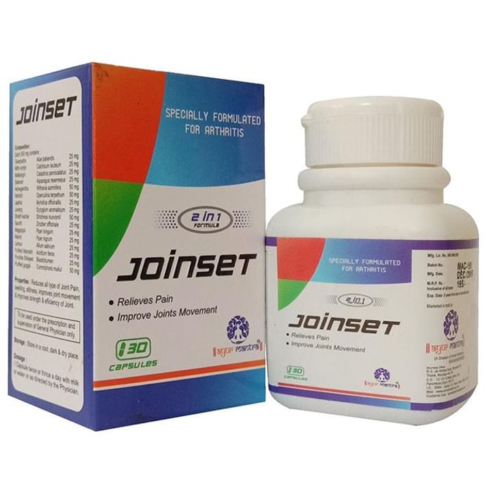 Ayur Mantra Joinset Capsule is a herbal blend of natural ingredients that provides relief from joint pain and inflammation. It helps enhance joint health. | Key Ingredients: Gwarpatha Ashwagandha Jaiphal Lahsun | Key Benefits: It helps relieve pain and inflammation in the joints It promotes joint flexibility and mobility It helps improve joint comfort and movement It helps enhance joint health | Directions For Use: Use as directed on the label | Safety Information: Read the label carefully before use Store in a cool and dry place, away from sunlight Keep out of reach of children