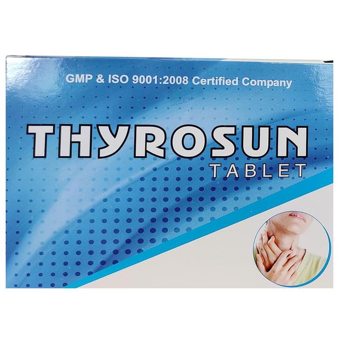 Ayursun Pharma Thyrosun Tablet is a dietary supplement that can help enhance energy. It contains levothyroxine, an alternative to thyroxine that is naturally produced by the thyroid gland. Thyronine controls the amount of energy used by the body. This tablet can be beneficial in the absence of thyroxine, as levothyroxine serves the same purpose. | Key Ingredients: Kachnar guggal Praval panchamrut Rasmanikya ras Triphala Krumikuthar ras Varun chhal Khadir Punarnava Jasat bhasma Gorakhmundi Gojiha Galo | Key Benefits: It can aid in managing the function of the thyroid gland The tablet can help deal with conditions associated with the thyroid gland, assuaging symptoms It can serve the purpose of thyroxine by regulating your energy levels It can help preserve your energy, reducing fatigue | Direction For Use: take 1-2 tablets two times a day after meals As directed by the healthcare professional | Safety Information: Self-medication is not advisable Store in a cool, dry place, away from direct sunlight Keep out of the reach and sight of children Discard use in case of an allergic reaction