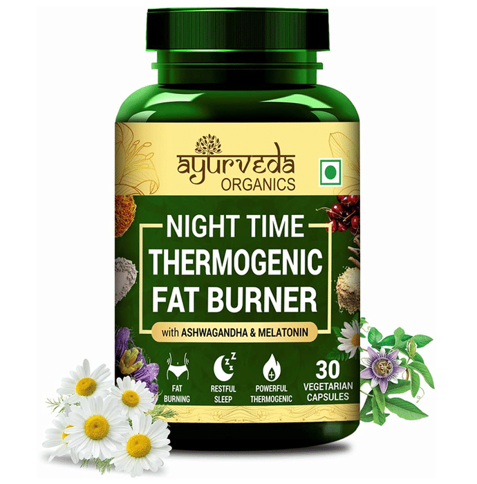 Ayurveda Organics Night Time Thermogenic Fat Burner Vegetarian Capsule Ayurveda Organics Night-Time Thermogenic Fat Burner Vegetarian Capsule is a dietary supplement that can manage weight. Suitable for both men and women, it can help reduce fat accumulation in different body areas, including the belly and thighs. It may help manage stress and anxiety, and it contains magnesium which can help with muscle recovery and enhance athletic performance.