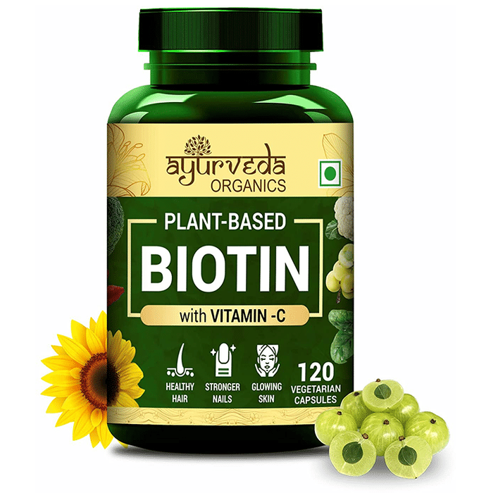 Ayurveda Organics Plant-Based Biotin with Vitamin C Vegetarian Capsule Ayurveda Organics Plant-Based Biotin with Vitamin C Vegetarian Capsule is a comprehensive blend of biotin, vitamins and herbs, primarily used to maintain healthy skin, nails and hair health. Beneficial for those who have brittle hair and are prone to excessive hair loss; it can help support the development of cells and tissues for healthy hair growth, adding volume and thickness to the hair.