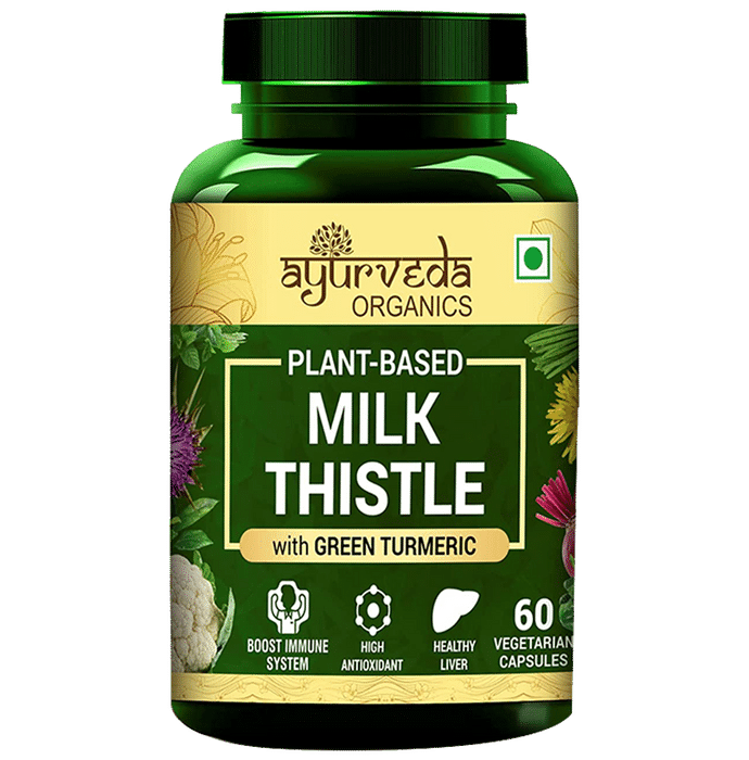 Ayurveda Organics Plant-Based Milk Thistle Vegetarian Capsule with Green Turmeric, primarily used to support liver health. With Milk Thistle as the primary ingredient, it helps detoxify the liver and removes impurities. Additionally, it promotes cellular health and contains anti-inflammatory and antioxidant properties, which help protect the body from the damage caused by free radicals. | Key Ingredients: Organic Milk Thistle Powder Radish Powder Ginger Powder | Key Benefits: Contains Milk Thistle as the active ingredient, which is a rich source of silymarin flavonoids- conventionally used to support liver health Helps detoxify the liver, and it can remove harmful impurities from the liver, ensuring optimal liver health Contains anti-inflammatory and antioxidant properties, which helps the body fight free radicals and supports good health It may also support skin health as it contains beneficial properties which may improve skin appearance All the ingredients are organically sourced, free from additives, preservatives, and sugar, and it is suitable for vegetarians and vegans | Directions For Use: Use as directed by the physician | Safety Information: Read the label carefully before use Do not exceed the recommended dose Keep out of the reach of children Store in a cool, dry place, away from direct sunlight