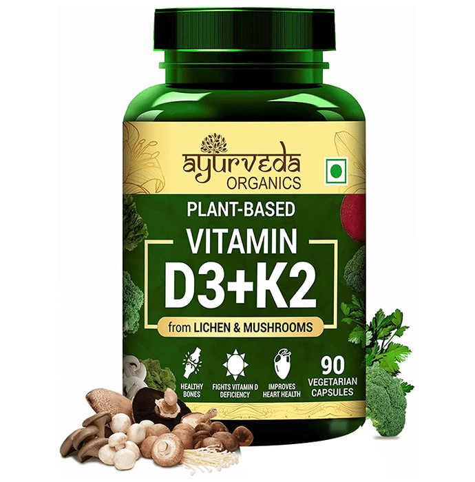 Ayurveda Organics Plant-Based Vitamin D3+K2 Vegetarian Capsule is a dietary supplement for individuals looking for appetite suppression for weight management. Vitamin D3 has many benefits, including improving bone health, teeth, and the immune system. It also helps in getting rid of toxins from the body. | Key Ingredients: Organic vitamin D3 Organic vitamin K2 Mushroom Lichen Mustard green Kale leaves Spinach leaves Beet root Broccoli Parsley | Key Benefits: The potent combination of vitamin D3 and K2 may help in maintaining healthy bones by increasing calcium absorption in the body By increasing calcium absorption, it also helps in keeping the teeth healthy It supports building stronger muscles by increasing muscle strength Vitamin D3 supports the immune system and improves heart health It can also aid in toxin removal from the body It can help in enhancing your mood and cognitive abilities This product is 100% natural and vegan It does not contain synthetic ingredients, preservatives, gluten, soy, or dairy This product is free from aspartame, yeast, gluten, milk, eggs, fish, wheat, shellfish, tree nuts, and peanuts It is a Non-GMO product | Directions For Use Take one capsule twice daily with water at mealtime or as suggested by a qualified healthcare professional Replace cap tightly after every use | Safety Information This product is not intended to diagnose, treat, cure, or prevent any disease(s) Health supplements should not be used as a substitute for a varied diet Do not exceed recommended doses Pregnant & lactating women or nursing mothers should take prior consultation before consuming this supplement Children under 18 years & individuals with known medical conditions should consult with a physician before using this supplement Store in a cool, dry place, away from direct sunlight and heat Keep out of reach of children