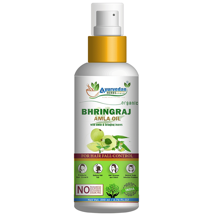 Ayurvedan Herbs Bhringraj Amla Hair Oil It is a herbal hair oil formulated with natural ingredients like amla, bhringraj leaves, neem, almond oil and argan oil that promotes healthy and strong hair. It helps to provide deep nourishment to the scalp and hair. It helps improve blood circulation to the hair follicles, strengthen the hair strands and stimulate new hair growth. It also helps prevent premature greying and reduces dandruff and hair loss. | Key Ingredients: Amla Bhringraj Neem Almond oil Argan oil | Key Benefits: It is a herbal hair oil that provides deep nourishment to the scalp and hair Bhringraj helps improve blood circulation to the hair follicles and stimulates new hair growth It can prevent premature greying and reduce dandruff and hair loss Amla works as a natural hair conditioner and helps prevent dandruff Almond oil is an emollient with essential fatty acids that can help moisturise the scalp and strands Argan oil provides strength to weak hair and promotes healthy and thicker hair Argan oil helps to increase hair elasticity and restore shine | Directions For Use: Apply an adequate amount of oil to your hair and scalp Use it once a day | Safety Information: Read the product label carefully before use Store in a cool and dry place away from direct sunlight Keep out of reach of children Do not use if the product appears to be tampered with or the seal is broken