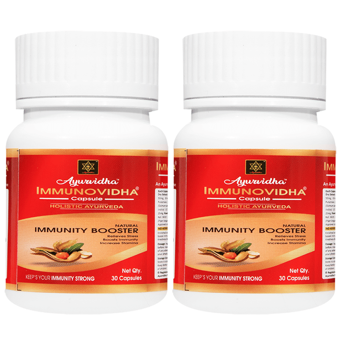 Ayurvidha Immunovidha Capsule (30 Each) Ayurvidha Immunovidha Capsule Bottle is made of six natural herbs, which can help to rejuvenate and reduce fatigue. The capsule contains ashwagandha, giloy, punarnava, tulsi, neem and haldi that might help in boosting immunity, stamina, relieving stress, reducing tiredness and fatigue.