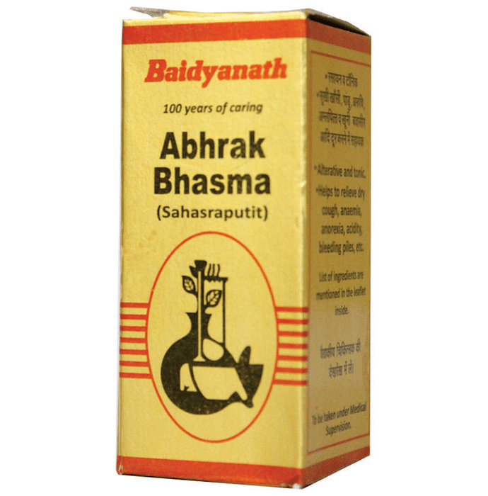 Baidyanath Abhrak Bhasma (Sahasraputit) is made with more potent ingredients to offer relief from chronic hyperacidity. It is used as alterative and tonic. | Key Ingredients: Abhrak patthar Kalonji Haritaki Dudh Gomutra Baheda chhilka Gud Aawala kali | Key Benefits: It is made with more potent ingredients It offers relief from chronic hyperacidity like vomiting It is also used as an alterative and tonic | Directions For Use: 125 to 150 mg with honey or ginger juice twice a day. | Safety Information: Read the label carefully before use Keep out of reach of children Store in a cool and dry place away from direct sunlight
