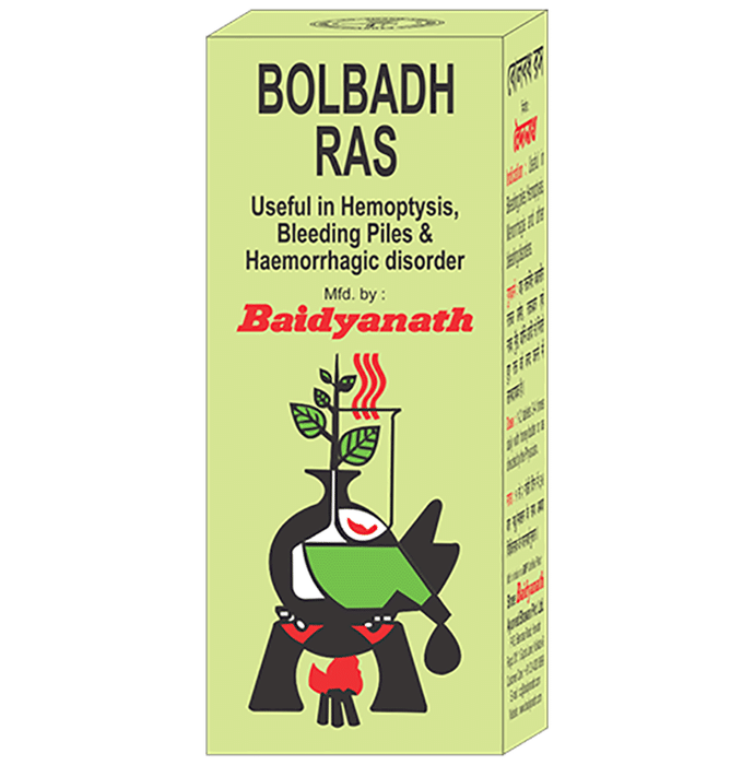 Baidyanath Bolbaddha Ras is a proprietary ayurvedic medicine which is used to cure excessive bleeding. This ras has haemostatic and astringent properties and is beneficial in the treatment of liver diseases, diabetes, abscess, hematurea and menorrhagia. | Key Ingredients: Guduchi Satva Rasendra Gandhaka Bola | Key Benefits: GuduchiSatva is a herbal powder, used in Ayurvedic treatment of burning sensation of feet, bleeding diseases etc. Gandhaka is used to treat chronic fever, skin diseases, diarrhoea, urinary tract disorders, pruritis, malabsorption syndrome, bleeding disorders, oligospermia etc. Bola or Myrrh is a versatile gum resin Orally administered to treat leucorrhea, heavy periods Used locally to treat boils, abscess, applied locally to treat gum disorders, sore throat etc. | Directions For Use: 1–2 teaspoons once or twice a day before or after food or as directed by physician | Safety Information: Store in a cool and dry place Keep away from direct heat and sunlight Do not exceed the daily recommended dose Keep out of the reach and sight of the children Use under medical supervision