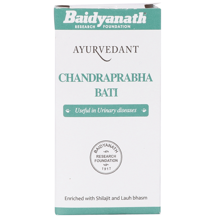 Baidyanath (Jhansi) Ayurvedant Chandraprabha Bati also called Chandraprabha Gulika and Chandraprabha Vatika is an ayurvedic classical medicine helpful for overcoming symptoms of diseases of kidneys, bladder, urinary tract, pancreas, bones, joints, and thyroid gland. It is also recommended to manage diabetes, men’s problems, women’s problems and mental disorders. Chandraprabha Vati is beneficial in difficulty in urination, kidney stones, frequent urination, urinary incontinence, prostate enlargement, male infertility, impotence, nightfall, diabetes, painful periods (dysmenorrhea), Oligomenorrhea, amenorrhea, polycystic ovarian disease, anxiety, mental stress, and depression. Baidyanath Ayurvedant is a range of 100% natural and safe products made with rare herbs collected from the foothills of the Himalayas. Each product combines the best of Ayurveda with years of dedicated research. Batch to batch performance and complete purity and safety are assured through the application of advanced pharmaceutical technology at every stage of manufacture | Key Ingredients: Kapur Kachari Vach Nagarmotha Chiraita Devdaru Trikatu Chandan Triphala Amalaki Bahera Shilajit Yavakshar Guggulu Daru Haridra Lauha Bhasma Banslochan | Key Benefits: It is helpful for urinary tract disorders like (UTI) and bladder-related issues It provides relief from muscle and joint pain It helps with general weakness | Directions For Use: Use as directed. | Safety Information: Read the label carefully before use Store in a cool and dry place away from direct sunlight Keep out of reach of the children