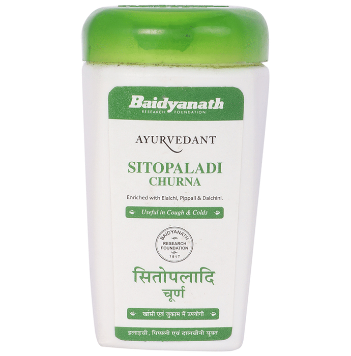 Baidyanath (Jhansi) Ayurvedant Sitopaladi Churna restores the normal function of the respiratory, digestive, and immune system. It aids in colds, fevers, debility, and bronchitis to offer relief. | Key Ingredients: Mishri Pipali Ela Tavakhir Dalchini | Key Benefits: Sitopaladi churna helps restore the normal functioning of respiratory, digestive, and immune system It is indicated for coughs, colds, fevers, and loss of appetite It aids in bronchitis, asthma and other respiratory distresses | Directions For Use: Use as directed by the physician. | Safety Information: Read the label carefully before use Store in a cool and dry place away from direct sunlight Keep away from reach of children