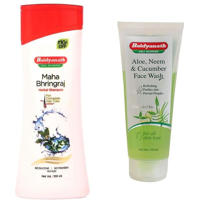Baidyanath (Jhansi) Combo Pack of Maha Bhringraj Herbal Shampoo 100ml & Aloe, Neem & Cucumber Face Wash 100ml Baidyanath (Jhansi) Combo Pack of Maha Bhringraj Herbal Shampoo 100ml & Aloe, Neem & Cucumber Face Wash 100ml is a combo pack of shampoo and face wash. The shampoo in this pack is formulated with extracts of the ancient vedic medicinal herb, bhringraj. It works as a complete hair care solution by reducing dandruff, hair fall and dry/itchy scalp. Face wash in this pack can cleanse the face of dust, impurities and pollutant. It also helps in maintaining moisture in the face.