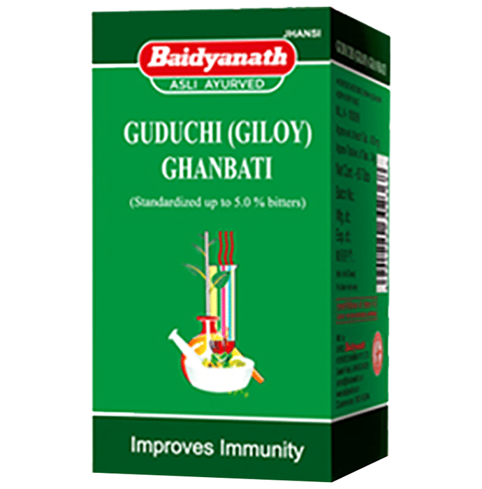 Baidyanath (Jhansi) Guduchi (Giloy) Ghanbati (60 Each) Baidyanath (Jhansi) Guduchi (Giloy) Ghanbati Giloy, a potent ayurvedic plant, is used to make it. It is full, safe to use, and has a number of excellent medicinal properties. It aids in the prevention of infections and urinary problems. It aids in the relief of fever and general ailment. It also helps in the treatment of colds and coughs.
