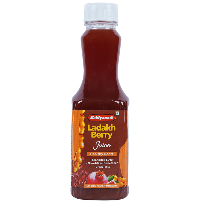 Baidyanath (Jhansi) Ladakh Berry Ready to Drink Juice is a ready-to-drink made with leh berry, arjuna and pomegranate juice that can improve the efficacy of heart muscles. It can also help in proper blood circulation, thus lowering the risk of heart problems. | Key Ingredients: Lah Berry Arjuna Pomegranate Sea buckthorn juice Guggul extracts Lemon juice Stevia Purified water Acidity regulator | Key Benefits: This juice can improve the strength of heart muscles and blood circulation and also lowers the risk of heart problems Baidyanath Ladakh Berry Juice's main ingredient is leh berry, a superfood from the himalayas filled with vitamins Buckthorn present in this drink is rich in vitamins C, E, K, omega-9, omega-6 and omega-7, which can reduce the risk of heart-related disease, cholesterol and stress This Juice has no added sugar, no artificial sweeteners and no fat | Directions For Use: Best when served chilled Once the bottle has been opened, consume it immediately, ready to serve | Safety Information: Read the label carefully before use Do not exceed the recommended dosage Store in a cool and dry place away from direct sunlight Keep out of reach of children