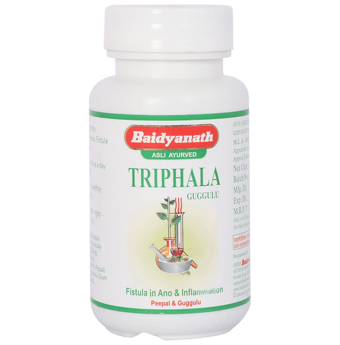 Baidyanath (Jhansi) Triphala Guggulu Tablet Baidyanath (Jhansi) Triphala Guggulu Tablet is an ayurvedic formulation that flushes out intestinal worms and aids in weight management, constipation, piles, liver problems and soft tissues. It is an effective remedial tablet that can be used for intestinal problems, indigestion, belly reduction, and flatulence.