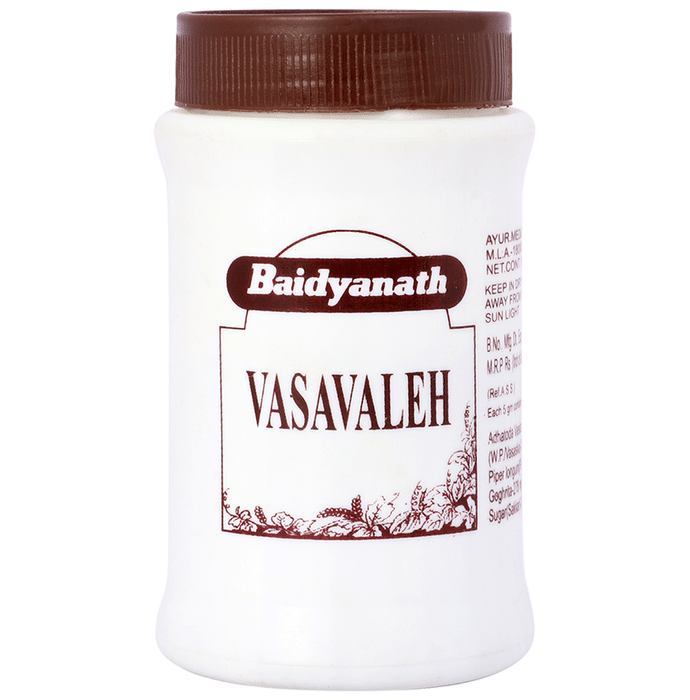 Baidyanath Jhansi Vasavaleh is polyherbal Ayurvedic preparation which is used to treat productive cough, cold, asthma and many other bleeding disorders. It is an Ayurvedic Avaleha in semi-solid form. | | Key Ingredients: Vasaka Pipali Ghrit Mishri | Key Benefits: Ayurvedic medicine with potent herbs, used primarily to manage respiratory ailments Indicated in chronic cases of coughing with breathing difficulties, associated with asthma and bronchitis Indicated in treating bleeding disorders including nasal bleeding, ulcerative colitis and menorrhagia | Directions For Use: Use as directed by the physician. | Safety Information: Read the label carefully Store in a cool and dry place Keep out of the reach of children