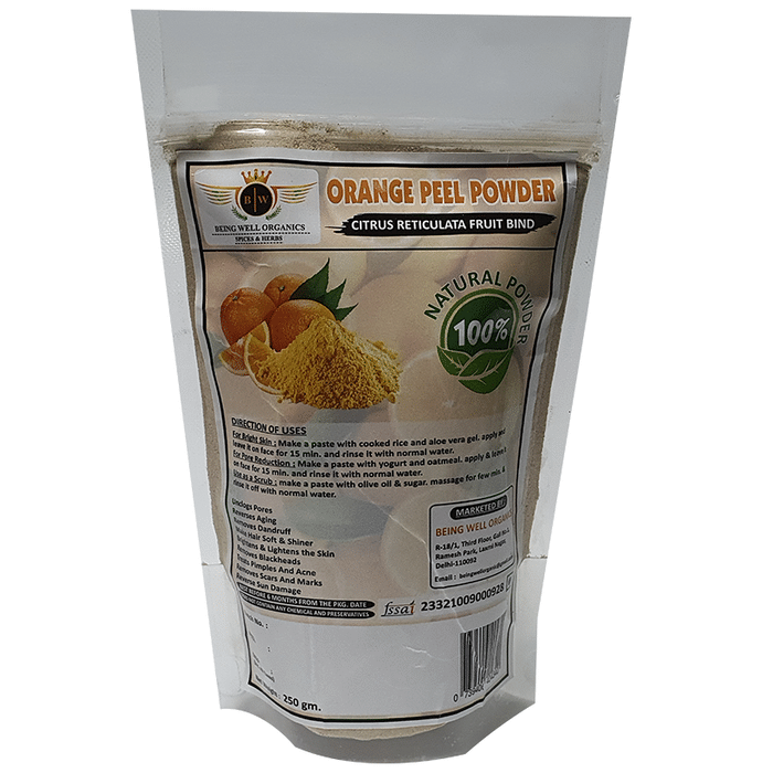 Being Well Organics Orange Peel Powder Orange peel powder contains antioxidants that can prevent oxidative stress and keeps signs of ageing at bay. It may help lighten and brighten the skin naturally. This powder might aid in cleansing the skin and fighting acne. | Key Ingredients: Orange peel powder | Key Benefits: Orange peel powder can help lighten and brighten the skin naturally It may aid in cleansing the skin and fighting acne It helps hydrate and moisturise the skin It is rich in antioxidants that can prevent oxidative stress on the skin It may assist in keeping signs of ageing away | Directions For Use: For bright skin: Make a paste with cooked rice and aloe vera gel. Apply it on the face and rinse it with normal water after 15 minutes. Use as a scrub: Make a paste with olive oil and sugar. Massage for a few minutes and rinse with normal water | Safety Information: Keep away from children Do not use under eyes Do not use on sensitive skin For external use only