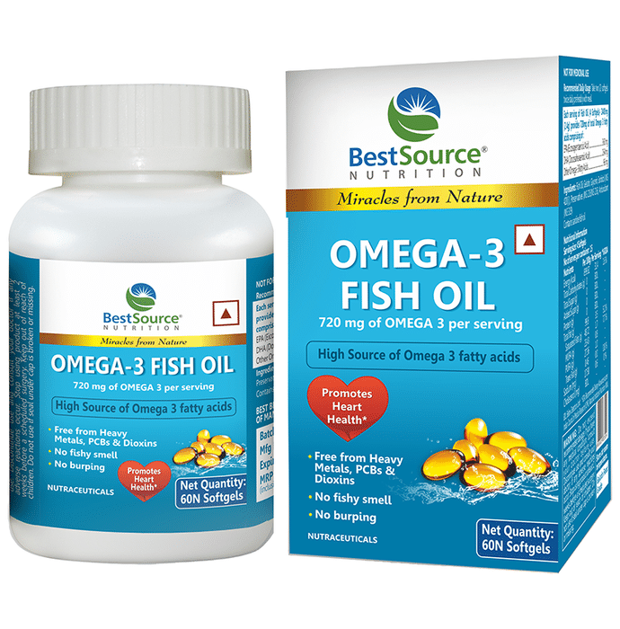 Bestsource Nutrition Omega-3 Fish Oil Capsule contains fish oil. Fish oil is the richest source of omega-3 fatty acids like eicosapentaenoic acid (EPA) and docosahexaenoic acid (DHA). Omega 3 fatty acids are good fats that must be consumed in a daily diet for health benefits. | Key Ingredients: Fish oil Gelatin Glycerin | Key Benefits: It increases good cholesterol and lowers bad cholesterol Maintain optimal triglyceride levels for a healthy heart It provides fish oil which is the richest source of omega-3 fatty acids Omega-3 can convert into anti-inflammatory substances like prostaglandins and leukotrienes, which are believed to support the health of joints by promoting flexibility, mobility, and pain relief It provides relief from rheumatoid arthritis | Direction For Use: Take two soft gels daily, preferably with a meal. | Safety Information: If you are pregnant, nursing, taking any medications, planning any medical procedure, or have any medical condition, consult your doctor before use Keep out of reach of children Use under medical supervision