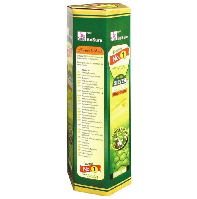 BeSure Doctor No.1 Noni Fruit Juice with Silver Gold Bhasham BeSure Doctor No.1 Noni Fruit Juice with Silver Gold Bhasham is formulated to provide relief in the case of gout and also helps to detoxify the body. The main ingredient Noni is known to boost the immune system of the body and promote a healthy heart, skin, and digestive system.