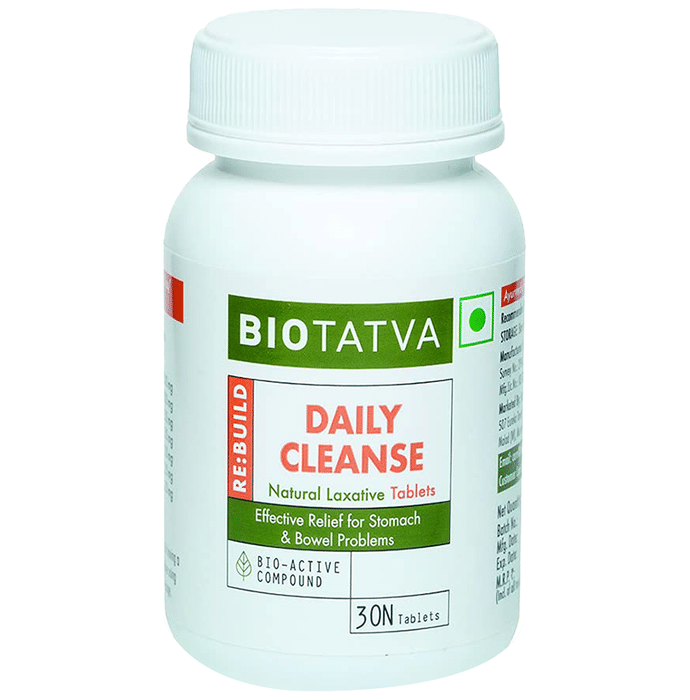 Biotatva Daily Cleanse Natural Laxative Tablet Biotatva Daily Cleanse Natural Laxative Tablet is formulated using completely natural Ayurvedic herbs of the best quality. It works as a natural laxative, reducing constipation, abdominal pain, and flatulence while also increasing the regularity and consistency of bowel movements. It helps to relieve constipation and also helps to regulate bowel movement. These tablets are beneficial for detox and debloating the body.
