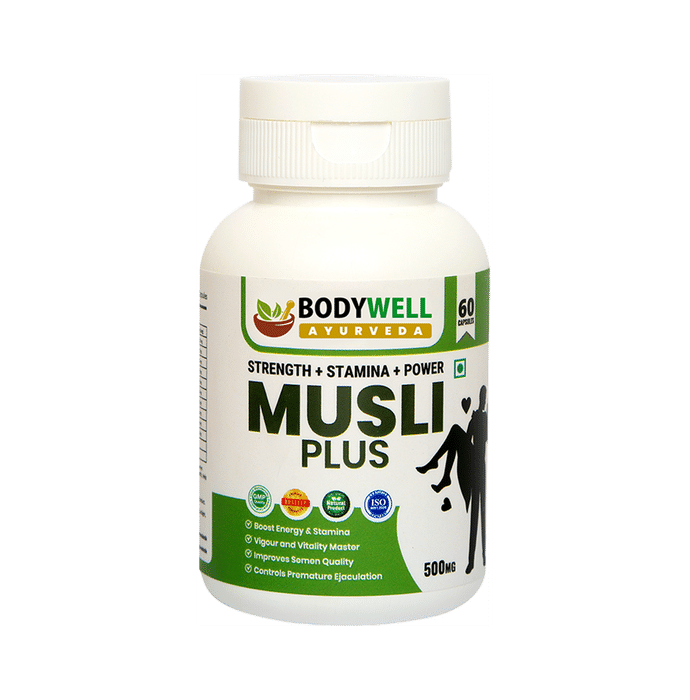 Bodywell Ayurveda Musli Plus Capsule is made from traditional Indian herbs recognized for their aphrodisiac properties. It is a herbal sex wellness product that is vital for promoting overall sexual health. It helps in enhancing male potency and reducing signs of fatigue. Besides, it helps in treating erectile dysfunction, increasing semen quantity and quality. These capsules assist in boosting sexual health by increasing the body's stamina and energy levels. | Key Ingredients: Safed Musli Kaunch Shilajit Goksura Javitri Akarkara Kokilaksha Talmakhana Trivang Bhasma Makardhwaj | Key Benefits: | HERBAL SEX WELLNESS PRODUCT FOR MEN AND WOMEN: Musli Plus is a natural and pure organic product that improves sexual desire, sperm count, quality and quantity of semen, testosterone level & enhances male fertility. It also helps women by enhancing sexual desire, performance, stamina and energy | IMMUNITY, ENERGY AND STAMINA BOOSTER: Best natural herbs including Safed Musli, Shilajit, Kaunch and Javitri. It is a strong vitalizer and natural immunity enhancer | STRESS RELIEVER AND BODY DETOXIFIER: It can reduce stress, which further helps to reduce the risk of weight gain, anxiety, depression. Helps in the detoxification of the body and is beneficial for brain and skin problems | HEALTHY FORMULA FOR HEALTHY MIND AND BODY: Contains 10 Indian organic herbs which enhance digestion, eliminate toxins from the body, improve absorption of nutrients which helps to lead a healthy life | BEST RESULTS WITH REGULAR DOSAGE: The product does not give instant benefits, but it has a long-term impact on overall health, sexual life, energy and stamina | Directions For Use: Take 2 capsules in a day. | Safety Information: Read the label carefully before use Store in a cool and dry place away from direct sunlight Keep out of reach of the children If you are pregnant, nursing or taking any other medication, you can consult a healthcare professional before taking this product