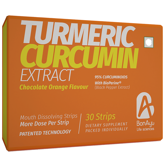 BonAyu Turmeric Curcumin Extract Mouth Dissolving Strip Chocolate Orange is formulated to promote healthy digestion, eyes, brain, heart and skin. The capsule provides relief in the case of diabetes and joint pain. It helps relieve nausea, headaches and poor digestion and also has anti-inflammatory properties. | Key Ingredients: Turmeric Vitamin C Black pepper | Key Benefits: Turmeric works as a pain reliever and provides relief in the case of arthritis These capsules protects the liver from the damage caused by toxins It promotes a healthy heart and digestive function The product helps to achieve healthy skin and eyes It supports healthy joints, enhances bioavailability and leads to better absorption It keeps a check on all the three doshas or physical energies (Vata, Pitta and Kapha) in the body It maintains a healthy immune system and supports healthy breathing It improves memory, concentration and performance on cognitive tasks | Directions For Use: Use as directed on the label or as advised by your healthcare provider. | Safety Information: Read the label carefully before use Store in a cool and dry place away from direct sunlight Keep out of reach of children