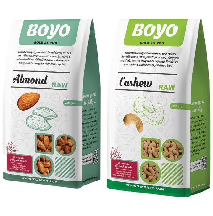 Boyo Combo Pack of Almond Raw & Cashew Raw (250 gm Each) Boyo Combo Pack of Almond Raw & Cashew Raw Calcium, iron, protein and dietary fibre are all abundant in cashew nuts. They are large and have a mild, nutty flavour, so they can be eaten raw or added to curries. Almonds are widely considered to be one of the world's most popular tree nuts, as they are abundant in fats, antioxidants, vitamins and minerals. These almonds are completely gluten-free and vegan. These raw nuts are high in proteins, fibre and minerals, all of which help to lower cholesterol levels. These nutritional nuts can be taken regularly to help prevent binge-eating and aid in weight management.