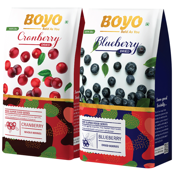 Boyo Combo Pack of Cranberry Dried (200gm) & Blueberry Dried (150gm) Boyo Combo Pack of Cranberry Dried & Blueberry Dried are premium quality and completely organic real dried berries. It contains high levels of antioxidants, dietary fibre, no gluten, zero trans-fat, zero cholesterol, low fat and no sodium. Blueberries and cranberries aid to follow an active lifestyle and are ideal for weight watchers. It helps to improve eyesight and may help to prevent early signs of ageing.