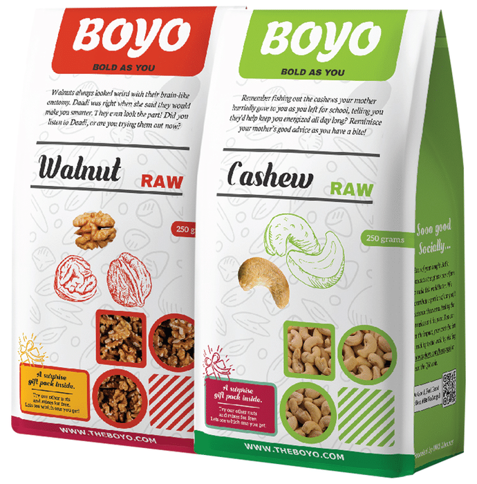 Boyo Combo Pack of Walnut Raw & Cashew Raw (250gm Each) Boyo Combo Pack of Walnut Raw & Cashew Raw Walnuts have been branded "brain food" because of their wrinkled appearance, which resembles that of a brain. Walnuts are simple to incorporate into one's diet and are high in nutritional value. They outperform most other nuts, including almonds, in terms of polyunsaturated fat, vitamins, and minerals such as potassium, iron, zinc and magnesium. Calcium, iron, protein and dietary fibre are all abundant in cashew nuts. They are large and have a mild, nutty flavour, so they can be eaten raw or added to curries. These nutritional drops can be taken regularly to help prevent binge-eating and aid in weight management.