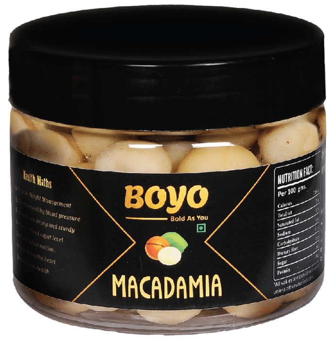 Boyo Macadamia is completely vegan and gluten-free and is high in plant protein and good cholesterol, which maintains the heart's health and boosts energy levels. This exotic nut contains antioxidants that protect the body from cellular damage and prevent the risk of diabetes, Alzheimer's disease and heart diseases by neutralising free radicals. Macadamia nuts are also high in monounsaturated fats, particularly palmitoleic acid, an omega-7 lipid that may help prevent weight gain. These nuts contain soluble fibre which acts as a prebiotic, feeding the good gut bacteria and these exotic nuts assist in managing blood sugar levels of the body. | Key Ingredients: Macadamia | Key Benefits: This nut is completely vegan and gluten-free, and it's high in plant protein and good cholesterol, which helps to keep the heart healthy and boosts energy levels This exotic nut contains antioxidants that neutralise free radicals to protect the body from cellular damage and reduces the risk of conditions like diabetes, Alzheimer’s disease and heart disease Macadamia nuts are also high in monounsaturated fats, particularly palmitoleic acid, an omega-7 lipid that may protect against weight gain Macadamia nuts contain soluble fibre that assists in the feeding of good intestinal flora and also helps to regulate blood sugar levels Here in Boyo, all the products are made with all-natural ingredients with no added preservatives | Directions For Use: Use as directed on the label or as prescribed by the physician. | Safety Information: Store in a cool and dry place Keep out of the reach of children Do not use if the seal is missing or damaged
