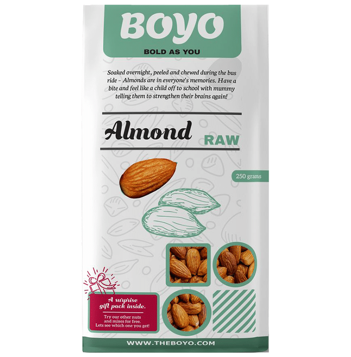Key Ingredients of Boyo Raw Almond: Almond | Key Benefits of Boyo Raw Almond: Helps boost immunity Reduces the risk of Alzheimer's disease Maintains blood pressure Lowers the risk of heart disease Rich in healthy fats Lowers cholesterol levels Strengthens bone health