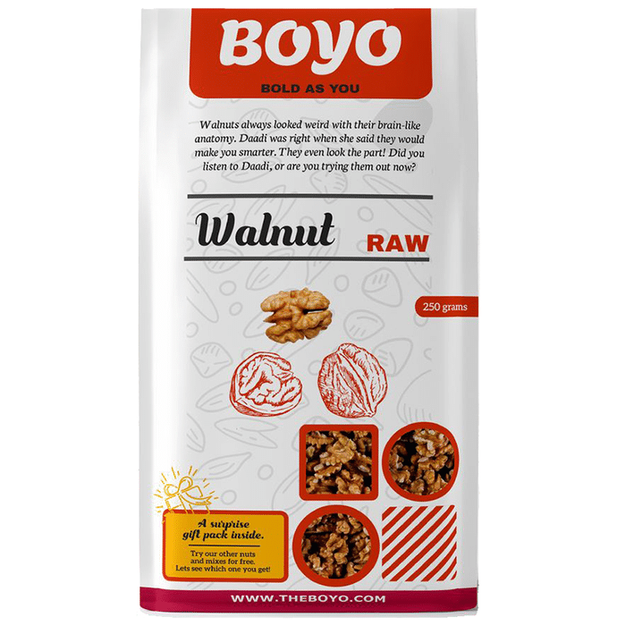 Key Ingredients of Boyo Raw Walnut: Walnuts | Key Benefits of Boyo Raw Walnut: Reduces inflammation Lowers cholesterol level Improves blood vessel function Suitable for weight loss Supports brain health Prevents oxidative damage to cells