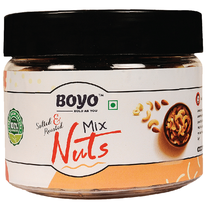 Boyo Salted & Roasted Mix Nuts Boyo Salted & Roasted Mix Nuts contains an abundance of nutrients from various nuts that are highly beneficial for the overall health. Calcium, iron, protein and dietary fibre are all abundant in cashew nuts. They are large and have a mild, nutty flavour, so they can be eaten raw or added to curries. Almonds are widely considered to be one of the world's most popular tree nuts, as they are abundant in fats, antioxidants, vitamins and minerals. These almonds are completely gluten-free and vegan. These raw nuts are high in proteins, fibre and minerals, all of which help to lower cholesterol levels. These nutritional nuts can be taken regularly to help prevent binge-eating and aid in weight management.