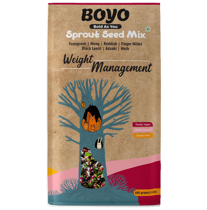 Key Ingredients of Boyo Weight Management Sprout Seed Mix: Mung Fenugreek Raddish Adzuki Black Lentil Finger Millet Moth | Key Benefits of Boyo Weight Management Sprout Seed Mix: Rich in fibre and antioxidants Improves digestion Works on the metabolism Aids in your weight loss journey Has a high-quality protein and fibre-rich profile Good for stomach health and reducing cholesterol