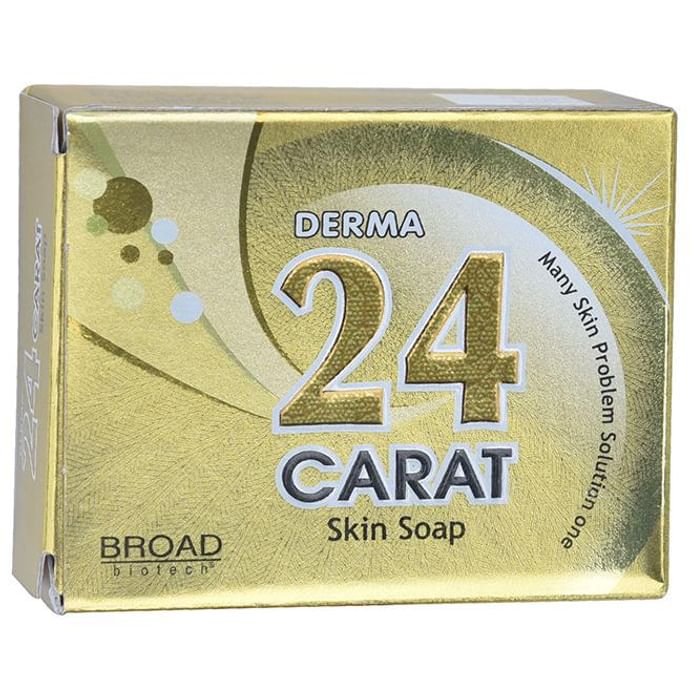 Broad Biotech Derma 24 Carat Skin Soap is a soap that can help deal with various skin issues. This soap can help remove dust, impurities and pollutants from the skin. Moreover, it can support skin health by reducing skin infections. | Key Ingredients: Daruharica (Berberis aristata) Lodhra (Symplocos racemosa) Turmeric (Curcuma longa) Coconut oil (Cocos nucifera) Red Sandalwood (Pterocarpus santalinus) Manishta (Rubia cordifolia) Aloe vera (Aloe barbadensis miler) | Key Benefits: This soap may help deal with allergies, bruises and pimples It may provide relief from irritation, redness and bleeding of the skin It can help deal with foot cracks and stretch marks This formulation may make the skin soft and supple | Directions For Use: Apply liberally twice daily, rinse well and soak. | Safety Information: Read the label carefully before use Do not exceed the recommended dosage Store in a cool and dry place away from direct sunlight Keep out of reach of children