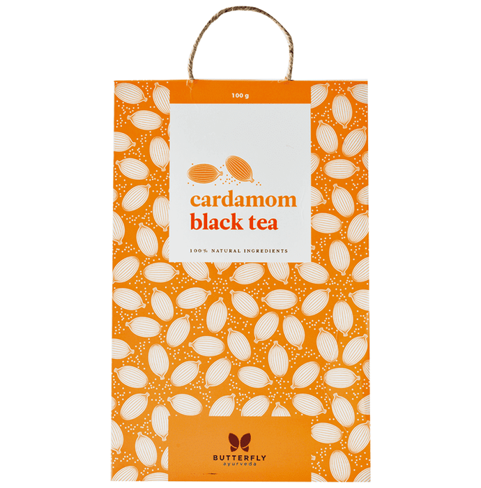 Butterfly Ayurveda Black Tea Cardamom is a herbal tea made from freshly sourced, aromatic cardamom pods. It helps to detoxify the body, improve digestion and pacify Pitta dosha. It makes for a fragrant cup of tea that leaves a long-lasting aftertaste. | Key Ingredients: Assam black tea leaves (Camellia sinensis) Elaichi (Eletaria Cardamom) | Key Benefits: It helps in balancing the Pitta dosha It has carminative properties that aid digestion It is an excellent source of antioxidants that boosts immunity Cardamom has anti-diabetic properties that help to manage blood sugar levels | Directions For Use: Use as directed on the label. | Safety Information: Read the label carefully before use Store in a cool and dry place, away from sunlight Store in an airtight container after opening