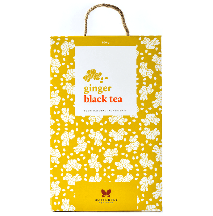 Butterfly Ayurveda Black Tea Ginger is a comforting and healing blend of dry ginger and rich Assam black tea leaves. It helps flush out toxins from the body and soothes sore throat and an uneasy stomach. It has a soothing, earthy flavour and is perfect for colder weather. | Key Ingredients: Ginger (Zingiber officinale) Assam black tea leaves (Camellia sinensis) | Key Benefits: It helps in balancing Vata and Kapha dosha It helps to provide relief from anorexia and colic pain It is a rich source of flavonoids which are excellent for the heart and brain It helps in removing congestion associated with cold | Directions For Use: Use as directed on the label | Safety Information: Read the label carefully before use Store in a cool and dry place, away from sunlight Store in an airtight container after opening
