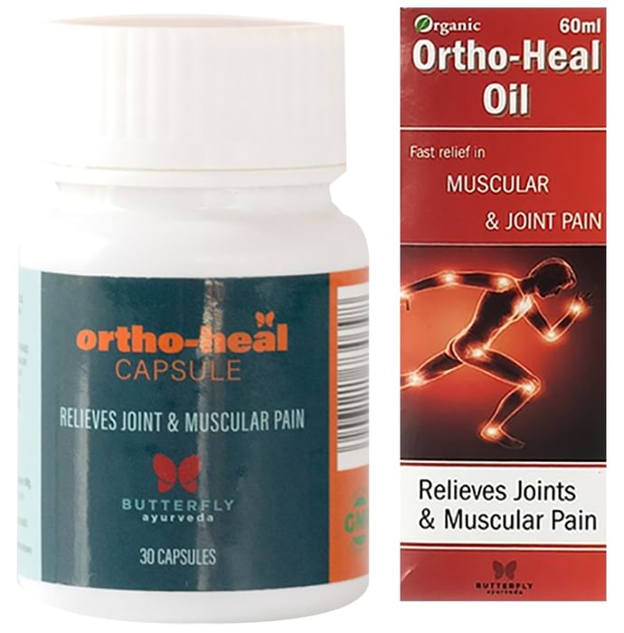 Butterfly Ayurveda Combo Pack of Ortho Heal Oil 60ml & Ortho Heal 30 Capsules It helps to relieve all kinds of pain and aches like neck pain, shoulder pain, lower back pain and arthritic pain. It promotes the healing of muscle injuries and reduces swelling and inflammation. | Key Ingredients: Guggul Gandhapura Peppermint Nilgiri oil Tarpin oil | Key Benefits: It induces relaxation and relieves pain without any side effects It reduces swelling, inflammation and joint pain It provides relief from arthritis, rheumatoid arthritis, spondylitis and related symptoms | Directions For Use: Use as directed on the label or as advised by your healthcare provider. | Safety Information: Read the label carefully before use Store in a cool and dry place away from direct sunlight Keep out of reach of children