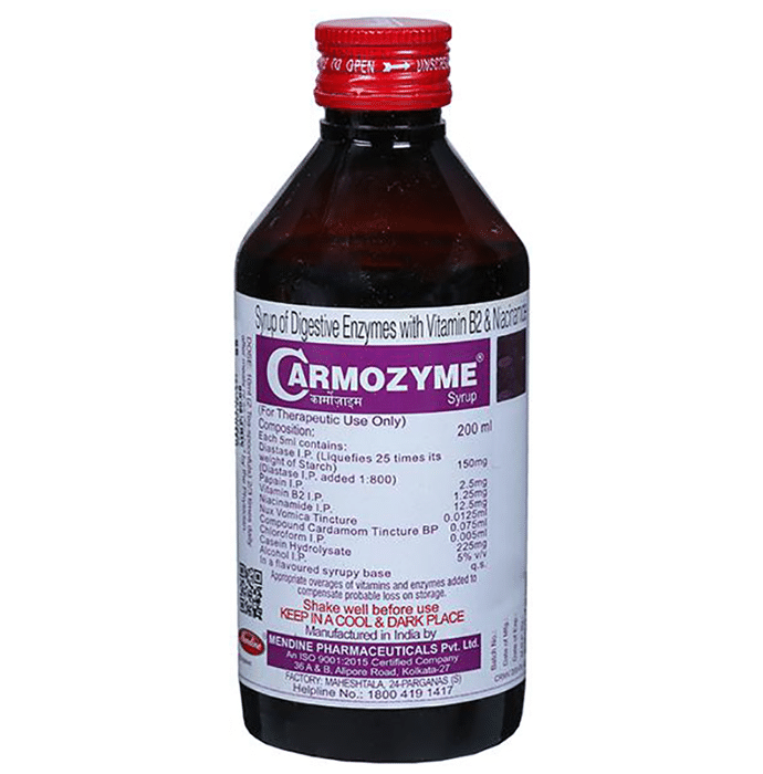 Carmozyme Liquid CarmoZyme Syrup is a blend of alcohol, fungal diastase, hydrolysed Casein and Papain as active ingredients that help improve digestion and relieve flatulence and indigestion. | Key Ingredients: Alcohol, Fungal Diastase, Vitamin B12, Niacinamide, Vomica Tincture, Hydrolysed Casein and Papain | Key Benefits: Carmozyme Liquid relieves digestive problems such as flatulence(gas), bloating, indigestion, constipation and other stomach and intestinal problems Carmozyme Liquid improves digestion and stimulates the appetite Carmozyme Liquid helps to treat the root cause of indigestion It helps relieve abdominal distension and dyspepsia | Good To Know: Formulated with Vitamin B12, Niacinamide, Vomica Tincture, Hydrolysed Casein and Papain | Concerns It Can Help With: Indigestion, dyspepsia, flatulence and other dyspeptic symptoms | Product Form: Syrup | Dosage: Take 10 ml of Carmozyme Liquid, 2-3 times daily after meal. | Directions For Use: Use as directed by the physician. | Safety Information: Read the label carefully before use Do not exceed the recommended dosage Store in a cool and dry place Keep it away from the reach of children