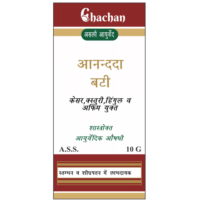 Chachan Aananda Vati is especially beneficial in male disorders like premature ejaculation and erectile dysfunction. It works by increasing the level of a chemical called serotonin in the brain. This improves your mood, relieves anxiety and tension and helps you sleep better. | Key Ingredients: Kesar Kasturi Hingul Opium | Key Benefits: It is an ayurvedic remedy which may be useful in treating men’s health-related issues It may help in managing premature ejaculation It may be useful in treating sexual debility It might help strengthen the male reproductive organ This improves your mood, relieves anxiety, tension and helps you sleep better | Directions For Use: Read the label carefully before use. | Safety Information: Read the label carefully before use Store in a cool and dry place away from direct sunlight Keep out of reach of children