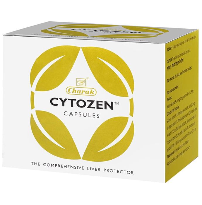 Charak Cytozen Capsule is a potent liver tonic. It contains herbs like Katuki(Picrorrhiza kurroa), Kalmegh(Andrographis paniculata), Punarnava( Boerhavia diffusa) and Kumari(Aloe barbadensis) that exhibit anti-viral, anti-inflammatory and hepato-protective properties. These herbs are rich in antioxidants that protect liver cells from damage. | Key Ingredients: Katuki(Picrorrhiza kurroa) Kalmegh(Andrographis paniculata) Punarnava( Boerhavia diffusa) Kumari(Aloe barbadensis) | Key Benefits: Improves liver functions Relieves nausea, vomiting and fatigue Maintains liver health Helps reduce the harmful effect of diseases and alcohol on the liver | Directions For Use: 1-2 capsule twice daily or as directed. | Safety Information: Read the label carefully before use Keep out of reach of the children Store in a cool dry place