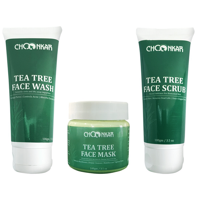 Choonkar Face Care Kit includes Choonkar Coffee Facial Kit which helps to get rid of unwanted blocked pores, allowing the skin to breath well and as a result, bring out a radiant and youthful complexion. Caffeine in the coffee promotes blood circulation and has a very refreshing and detoxifying effect on the skin. Coffee also has anti-aging properties which are helpful in diminishing wrinkles and exfoliant agent in coffee is helpful in reducing acne. The Kit includes: Coffee Face Wash, Coffee Face Scrub and Coffee Face Mask. In addition to this, the Choonkar Tea Tree Face Care Kit removes dead skin cells to reveal revitalized skin. The Kit Includes: Tea Tree Facial Wash, Tea Tree Facial Scrub, and Tea Tree Face Mask. | Key Ingredients: The key ingredients are as mentioned in the variants. | Key Benefits: | Coffee Coffee scrub helps to exfoliate the skin. It removes residual dirt and dead skin to give a younger-looking, fresh skin The caffeine found in coffee scrub typically increases blood flow and may reduce the appearance of cellulite Caffeine works to make blood vessels tighter and firmer very quickly, which is reflected in the skin texture and gives it a firmer appearance It encompasses antioxidants which neutralize the effects of free radicals and can help prevent premature aging The product helps to prevent premature wrinkles and fine lines | Tea Tree It fights acne and brightens the skin The product helps to clear scars, spots, and pigmentation It facilitates removal of dirt even from the deep inside the pores The product inhibits excess oil production It is full of antioxidants, nutrients, and minerals Provides calming & soothing effect to the skin Facilitates glowing skin and exfoliates the dead skin cells | Directions For Use: | Choonkar Coffee Facial Kit | Coffee Face Wash: Pour a small quantity of Choonkar coffee face wash onto your palm and apply it on your face. Gently massage onto the face for 5-10 mins and rinse well with lukewarm/cold water | Coffee Face Scrub: Apply a healthy portion of Choonkar coffee face scrub and massage in a circular upward motion. Allow 10-15 minutes and wash it off with lukewarm water. This face mask will help to get rid of dead skin cells, allowing you to have glowing skin Coffee Face Mask: Clean your face with a mild face wash. Apply a generous amount of the coffee mask. Spread it into an even layer on the face. Avoid the area around the eyes, brows, and lips. Leave the mask on for 15-20 minutes. Rinse it off with lukewarm water | Choonkar Tea Tree Face Care Kit | Tea Tree Face Wash: Apply a pea-size amount of Choonkar Tea Tree Face Wash on damp face. Work up a mild lather and back rub your face in a delicate, hostile movement to clockwise round developments for 1-2 minutes. Rinse well with lukewarm water | Tea Tree Face Scrub: Apply a healthy portion of Choonkar Tea Tree Face Scrub and massage in a circular upward motion. Allow 5-10 minutes before rinsing thoroughly. For best results, use regularly | Tea Tree Face Mask: Clean your face with a mild face wash apply a generous amount of the Tea Tree Mask spread it into an even layer avoid the area around the eyes, brows, and lips. Leave the mask on for 15 to 20 minutes and rinse it off with lukewarm water | Safety Information: Read the label carefully before use Store in a cool dry place away from direct sunlight Keep out of reach of the children Use under medical supervision Do not exceed the recommended dose