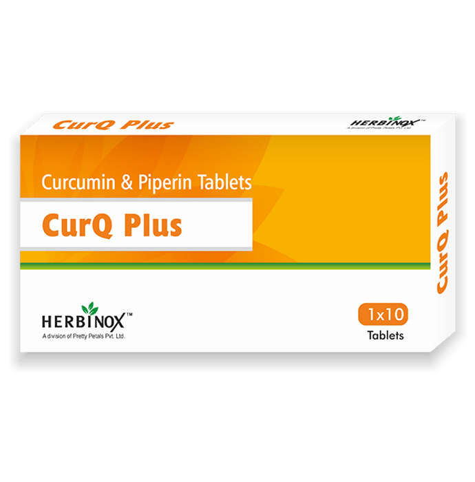 CurQ Plus Tablet is a dietary supplement that can help reduce inflammation and muscle soreness. It can help enhance speedy recovery from injuries and muscle strain. The tablet can aid in increasing the absorption of nutrients into the body. It serves as a supplement that can serve multiple benefits. | Key Ingredients: Curcumin Piperine | Key Benefits: It can help regulate your blood sugar levels The tablet can help reduce inflammation and muscle soreness It can serve as an antioxidant that can help reduce the growth of free radicals The composition can help increase immunity and the absorption of nutrients into the body It can help enhance speedy recovery from injuries | Direction For Use: As directed by the health care professional | Safety Information: Store in a cool, dry place, away from direct sunlight Keep out of the reach and sight of children Discard use in case of allergic reaction
