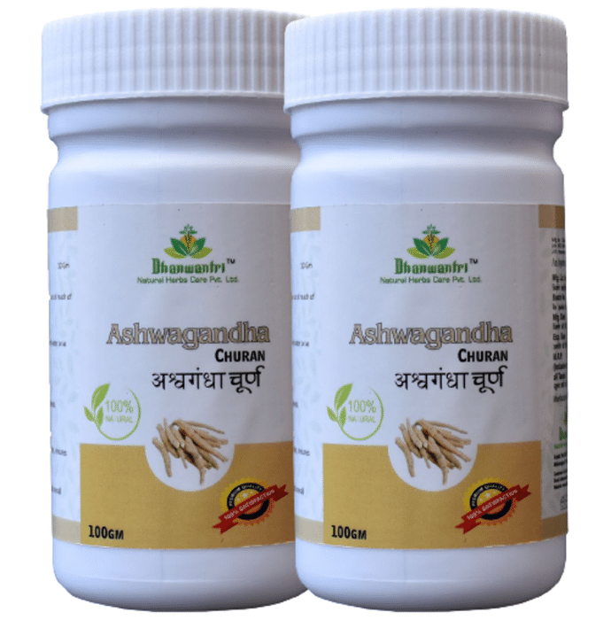 Dhanwantri Ashwagandha Churan(100gmEach) Dhanwantri Ashwagandha Churan is formulated from ashwagandha, commonly known as the winter cherry or Indian ginseng. This churna is rich in antioxidants that may help the body fight against various infections. It can relieve stress and improve overall health and immunity. It can help to maintain and uplift the energy levels throughout the day. This powder has numerous health benefits that help in maintaining general health and wellness.