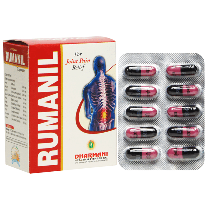 Dharmani Rumanil Capsule It is a carefully crafted formula with a unique combination of herbs. It can help increase calcium levels in the body and strengthen bones and joints. These herbs may help eliminate joint pain and stiffness and improve joint flexibility. | Key Ingredients: Kesar Karpur Hartal Shudh kuchla Pipal Amla Sonth Bel Suranjan | Key Benefits: Helps in providing relief to chronic pain like arthritis, gout and low back pain It provides the optimal amount of calcium required for fragile joints and boosts the strength of bone and cartilage It may help prevent osteoporosis and common fractures of the joints Helps to promote joint and movement flexibility by restoring mobility and reducing pain in joints | Directions For Use: 1-2 capsules twice or thrice daily with milk or water or as directed by the physician. | Safety Information: Read the label carefully before use Store in a cool and dry place away from direct sunlight Keep out of reach of children