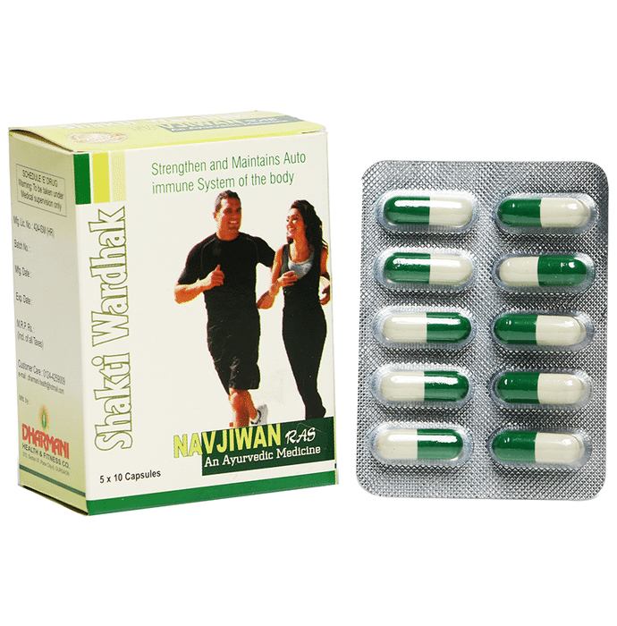 Dharmani Shakti Wardhak Nav Jiwan Ras Capsule Dharmani Shakti Wardhak Nav Jiwan Ras Capsule These capsules help the immune system fight against various viral, bacterial and other diseases. It helps to improve appetite and digestion, as well as reduce stomach ache, heartburn, indigestion, intestinal gas, diarrhoea and cholera. It might also be helpful to deal with lung problems including asthma, bronchitis and cough.